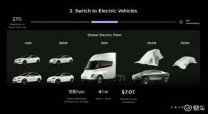 第二步,汽车转向电动化,有望减少21%的化石能源使用。马斯克表示,汽车电池可以和静态储能一起,实现115TWh的总容量。为达到这一目标,特斯拉每年需要生产2000万台电动汽车,并打造一支拥有约8500万辆汽车的全球化电动车队。根据特斯拉的规划,这一目标有望再2030年实现。