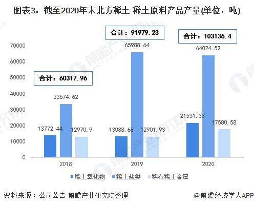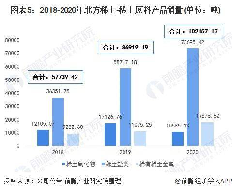 在产量方面,2018-2020年,北方稀土原料产品产量逐年增长。2020年,公司稀土原材料产品产量为102157.17吨,其中稀土氧化物产量为10585.13吨;稀土盐类产量为73695.42吨;稀有稀土金属产量为17876.62吨。
