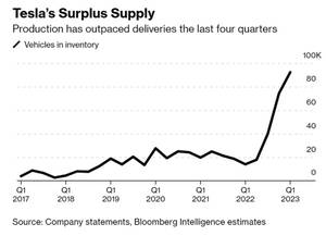 特斯拉汽车库存一直在攀升;图片来源:彭博社
