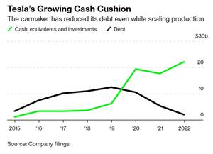 特斯拉现金储备不断增长,债务不断下降;图片来源:彭博社