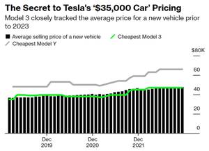特斯拉车辆最低价与美国新车平均交易价格的差距;图片来源:彭博社