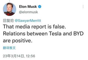 2023年3月14日,《韩国经济日报》发文称,特斯拉决定不使用比亚迪的电池。马斯克在推特上对此回应称:“该报道为假新闻。特斯拉和比亚迪的关系依然稳固。”