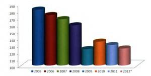 2012年1~8月,DTC合计向市场供应了约40亿美元钻石毛坯,比2011年同期减少了23%。值得注意的是,8月份DTC看货会上,DTC一反常态,将钻石毛坯价格大幅下调,平均下调了8%左右,部分品种的价格下调17%。De Beers总裁Phillipe Mellier指出这次的价格调整反映了市场情况,即比较准确地反映了成品钻石市场的情况,他同时强调“看货商不应该再允许钻石价格下行”,DTC钻石毛坯价格短期内已经没有下调的空间。看货商认为:这次降价是“明智之举”,推动毛坯价格向着正确的方向靠拢。事实证明,这种判断是正确的,2012年10月份DTC的看货会后钻石毛坯价格维持原有水平,销售量(额)增加至2012年年内新高的7亿5000万美元。但是,看货商们似乎情绪仍然不高,因为他们觉得毛坯价格仍然处于高位,随着劳动力成本上升、零售市场的不温不火的表现,导致切磨利润很小。