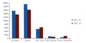 DeBeers2012年全年的钻石生产可到达2800万~3000万克拉,即比2011年减少约10%。Alrosa2012年全年的钻石市场将比2011年略低。力拓集团钻石业务将会好于2011年,2012年的1~9月,Rio Tinto共开采出了987.3万克拉钻石,比2011年增长13%,预计2012年全年力拓将生产1260万克拉的钻石,比2011年全年增长7%左右。这些钻石产量的增加主要是由于位于西澳的Argyle矿山恢复所致。BHP延续了上半年的趋势,2012年第三季度钻石生产较2011同期减少32%,估计BHP全年钻石市场会低于2011年约25个百分点。
