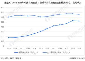 2010年以来,中国保险密度快速增长,与全球平均保险密度的差距不断缩小。2021年中国保险密度为520美元/人,而全球平均保险密度为661美元/人。