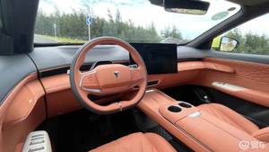如果外观是张狂,性格外放,那么,内饰风格就是收敛,舒展品味。艇式环抱设计,同样采用极简的设计风格,中控台只有一个15.6英寸随驾智能转向的向日葵屏,没有任何物理按键。传统的仪表盘也没有了,所以得行车信息都集成在前方的HUD抬头显示。