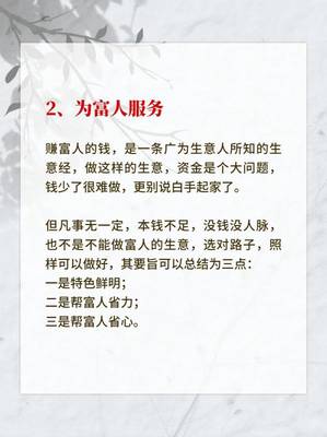 但凡事无一定,本钱不足,没钱没人脉,也不是不能做富人的生意,选对路子,照样可以做好,其要旨可以总结为三点: