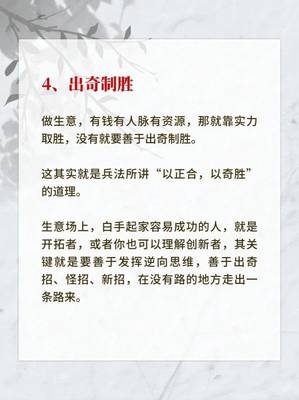 做生意,有钱有人脉有资源,那就靠实力取胜,没有就要善于出奇制胜。