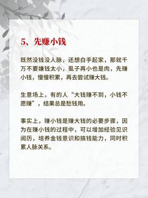 事实上,赚小钱是赚大钱的必要步骤,因为在赚小钱的过程中,可以增加经验见识阅历,培养金钱意识和搞钱能力,同时积累人脉关系。
