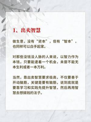 当然,靠出卖智慧要求极高,不仅要善于开动脑筋,关键是要有脑筋,说到底就是要靠学习和实践先提升智慧,然后再用智慧去想搞钱的法子。