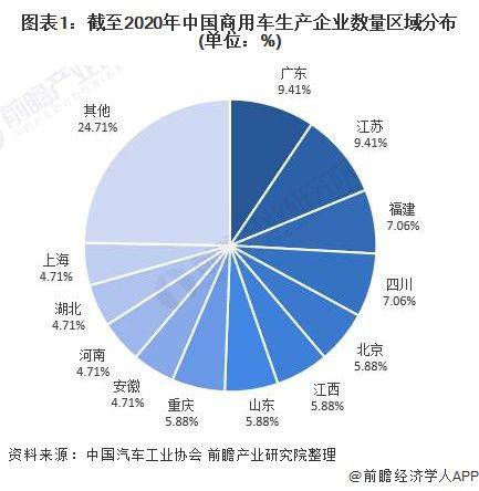 商用车属于重资产行业,生产企业数量分布广,市场竞争充分。根据中国汽车工业协会统计,截至2020年,中国商用车生产企业共有85家,从商用车生产企业分布来看,广东和江苏商用车生产企业数量领先,均为8家,福建和四川商用车生产企业有6家,北京、江西、山东、重庆商用车生产企业数量为5家。
