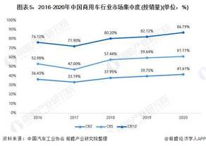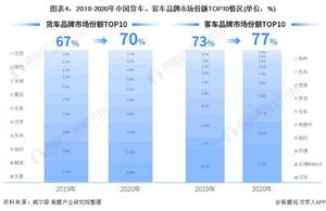 从中国商用车行业市场集中度来看,2020年,前十品牌合计销量达445.5万辆,占比合计达到86.79%,CR3、CR5、CR10份额较2019年均呈现进一步扩大,头部企业的稳定度越来越高,市场的集中度也在逐步提升。