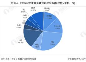 融资轮次方面,由于我国在智能制造方面还属于初级阶段,各种技术还不成熟,因此我国在智能制造领域的企业大多都还处于初创阶段,由此在融资方面也为A轮之前较多。2019年,我国智能制造A轮前融资事件大约占据了当年总融资次数的50%多,其中A轮融资事件发生49次,占比25.65%;融资金额74.74亿,占行业总融资比例为8.92%,A轮前后融资额(A轮、Pre-A轮、A+轮)占总融资额的14.83%。