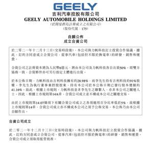 2021年12月,吉利汽车发布公告,公司拟与力帆科技共同投资设立合资公司,目标公司注册资本为人民币6亿元,吉利控股与力帆科技各出资3亿元,持股比例均50%。2022年1月,吉利汽车与力帆科技共同投资设立的合资公司已完成工商注册登记手续,并取得中国重庆两江新区市场监督管理局颁发的营业执照,定名为重庆睿蓝汽车科技有限公司(“睿蓝汽车”)。