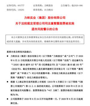 销量的下滑,也造成了力帆陷入严重亏损中。2020年7月,力帆发布公告,因不能清偿到期债务,多家子公司被债权人向法院申请司法重整,公司将存在因重整失败而被破产的风险。至此,力帆走上破产重整的道路。次月,法院裁定受理力帆破产重整,同时公司股票被实施退市风险警示,股票简称改为“*ST力帆”。