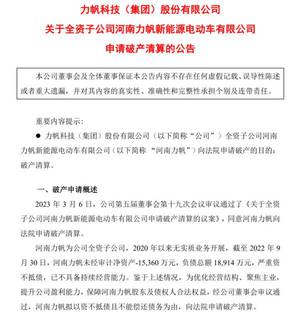3月6日,力帆科技(集团)股份有限公司(下称“力帆科技”)发布公告称,董事会审议通过了《关于全资子公司河南力帆新能源电动车有限公司申请破产清算的议案》,同意河南力帆向法院申请破产清算。