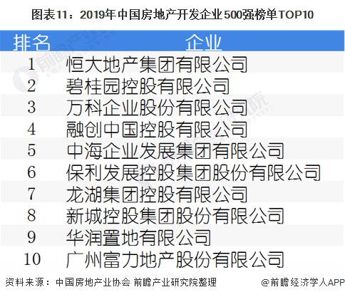 由中国房地产业协会于2020年3月发布的《中国房地产开发企业500强测评研究报告》披露的数据显示,在2020年中国房地产开发企业500强榜单中,恒大集团再次蝉联第一,2019全年全口径销售金额6080亿元。碧桂园上升一位,排名第二,万科排名第三。三强全年全口径销售金额都超过了6000亿元。融创,中海,保利,龙湖,新城,华润和富力分列四到十位,中海名次相比2018年提升了1位,十强房企排名整体比较稳定。