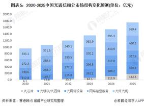 已经渐入高潮的5G网络建设会终结光通信产业短暂的下滑趋势。然而,相较于FTTX,5G对光通信整体需求较小且平稳,难以再造复合增长率高达15%的“辉煌十年”。短期来看,从光纤光缆和光设备环节出发,行业龙头企业凭借体量优势将业务逐渐延伸至上游光器件、光模块、光芯片等高利润环节;中长期来看,光通信领域的核心价值在于5G及数通行业应用,目光长远的企业已经开始积极拥抱5G新业态,共同助力中国光通信市场繁荣。初步估计中国光通信市场规模仍将保持12%左右的年均复合增速,到2025年市场规模阶超过1700亿元。