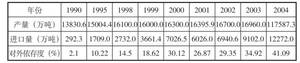 年份199019951998199920002001200220032004产量(万吨)13830.615004.416100.016000.016300.016395.916700.016960.0117587.3进口量(万吨)292.31709.02732.03661.47026.56026.06940.69102.012272.0对外依存度(%)2.110.2214.518.6230.1226.8729.3534.9241.09