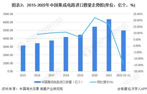 2015-2021年,中国集成电路进口数量整体呈现上涨趋势,2021年进口规模达到6355亿个,同比增长16.93%。2022年前11个月,中国集成电路进口规模为4985亿个,同比大幅下降14.4%。
