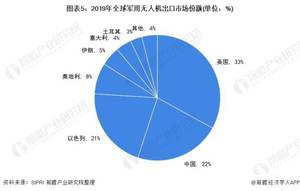 据起点研究院(SIPRI)公布数据,2019年,在无人机出口市场,中国占全球军用无人机出口市场份额的22%,仅次于美国。