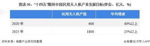从无人机行业的发展趋势来看,我国民用无人机市场有望继续扩大。据2017年《工业和信息化部关于促进和规范民用无人机制造业发展的指导意见》明确了民用无人机产业的发展目标,到2025年,我国民用无人机产值达到1800亿元,年均增速25%以上。产业规模、技术水平、企业实力持续保持国际领先势头,建立健全民用无人机标准、检测认证体系及产业体系,实现民用无人机安全可控和良性健康发展。