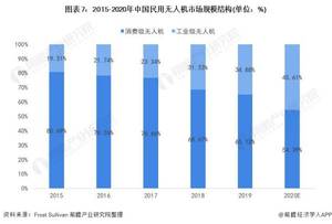 民用无人机主要分为消费级无人机和工业级无人机。从市场规模结构上看,2015年以来,我国工业级无人机在民用无人机市场份额占比逐年上升,2019年,在民用无人机市场中,工业级无人机市场份额占比达34.88%,至2020年,工业级无人机市场占比约达45.61%,未来市场占比仍将保持增长趋势。
