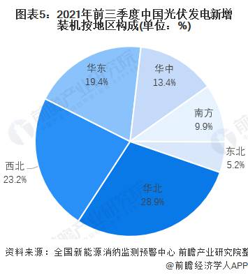 从全国并网光伏发电新增装机布局看,2021年前三季度,我国华北地区新增装机8027.6万千瓦,占全国的28.9%;西北地区新增装机6456.8万千瓦,占全国的23.2%;华东地区新增装机5390.6万千瓦,占全国的19.4%;华中地区新增装机3716.2万千瓦,占全国的13.4%;南方地区新增装机2753.1万千瓦,占全国的9.9%;东北地区新增装机1438.4万千瓦,占全国的5.2%。