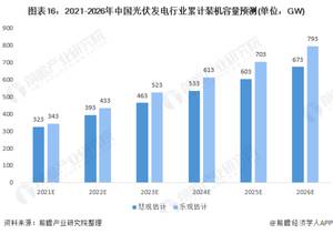 在政策推动和光伏发电成本下降的利好之下,光伏装机容量将持续攀升。根据中国光伏行业协会的预测,在“十四五”期间,我国光伏年均新增光伏装机或将在70-90GW之间,为达成2030年碳达峰,2060年前实现碳中和,光伏行业将成为长期处于高速发展的新能源行业之一,据此预测2026年我国光伏发电行业累计装机量可能在673-793GW之间。