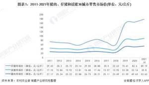 2011-2018年,猪肉、仔猪和活猪36城市零售市场价整体波动变化,2019年由于非洲猪瘟影响,价格迅速上涨,2020年加上新冠疫情影响,整体价格居高不下,截止2021年1月底,猪肉和活猪市场价分别为53.63元/公斤和35.8元/公斤,仔猪价格不断走高,价格89.19元/公斤,创近十年新高。
