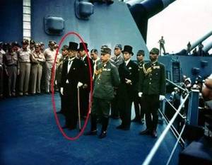 这里要重点提下老爷子第二个老婆日本人重光初子,这个二夫人不简单,是二战时期日本甲级战犯重光葵的外甥女。中间那个红圈里的就是重光葵。
