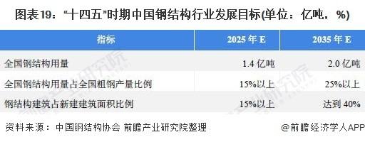 2021年10月,中国钢结构协会发布了《钢结构行业“十四五”规划及2035年远景目标》,提出钢结构行业“十四五”期间发展目标:到2025年底,全国钢结构用量达到1.4亿吨左右,占全国粗钢产量比例15%以上,钢结构建筑占新建建筑面积比例达到15%以上。到2035年,我国钢结构建筑应用达到中等发达国家水平,钢结构用量达到每年2.0亿吨以上,占粗钢产量25%以上,钢结构建筑占新建建筑面积比例逐步达到40%,基本实现钢结构智能建造。