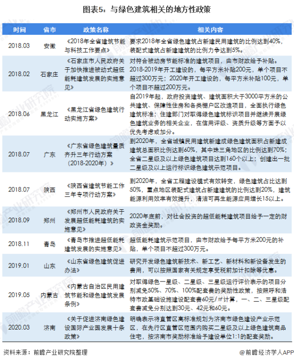 此外,多个省市相继出台相关政策,支持低能耗绿色建筑的发展。2018年7月,广东省发布《绿色建筑量质齐升三年行动方案》,指出到2020年,全广东省城镇民用建筑新建成绿色建筑面积占新建成总面积比例达到60%。2019年1月山东出台《山东省绿色建筑促进办法》,表示研究开发绿色建筑新技术、新工艺、新材料和新设备发生的费用,可以按照国家有关规定享受税前加计扣除等优惠。2020年3月15日,济南发布《关于促进济南绿色建设国际产业园发展十条政策》,明确对符合二星级及以上绿色建筑标识的项目,按济南市奖励标准给予建设单位1:1的配套奖励。政策春风不断推动绿色建筑行业发展。