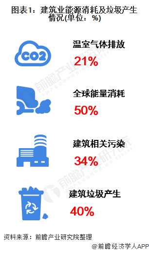 水泥、砂子、水、钢材是建筑行业的主要原材料,每年这些原材料的消耗量非常巨大。中国住房和城乡建设部的统计数据显示,在全球范围内,有超过40%的能源消耗和21%的温室气体排放来源于建筑业。人类从自然界所获得的50%以上的物质原料用来建造各类建筑及其附属设备。这些建筑在建造和使用过程中又消耗了全球能量的50%左右;与建筑有关的空气污染、光污染、电磁污染等占环境总体污染的34%;建筑垃圾占人类活动产生垃圾总量的40%。因此,探索并建立可持续的建筑业发展模式具有较大意义,绿色建筑发展需求非常大。