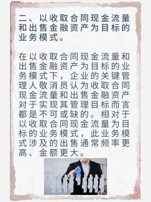 在以收取合同现金流量和出售金融资产为目标的业务模式下,企业的关键管理人敬消员认为收取合同现金流量和出售金融资产对于实现其管理目标而言都是不可或缺的。相对于以收取合同现金流量为目标的业务模式,此业务模式涉及的出售通常频率更高、金额更大。