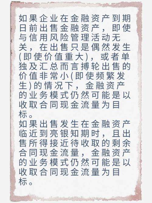 )如果企业在金融资产到期日前出售金融资产,即使与信用风险管理活动无关,在出售只是偶然发生(即使价值重大),或者单独及汇总而言搏轮出售的价值非常小(即使频繁发生)的情况下,金融资产的业务模式仍然可能是以收取合同现金流量为目标。