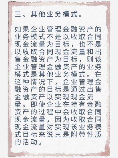 如果企业管理金融资产的业务模式不是以收取合同现金流量为目标,也不是以收取合同现金流量和出售金融资产为目标,则该企业管理金融资产的业务模式是其他业务模式。在这种情况下,企业管理金融资产的目标是通过出售金融资产以实现现金流量。即使企业在持有金融资产的过程中会收取合同现金流量,因为收取合同现金流量对实现该业务模式目标来说只是附带性质的活动。