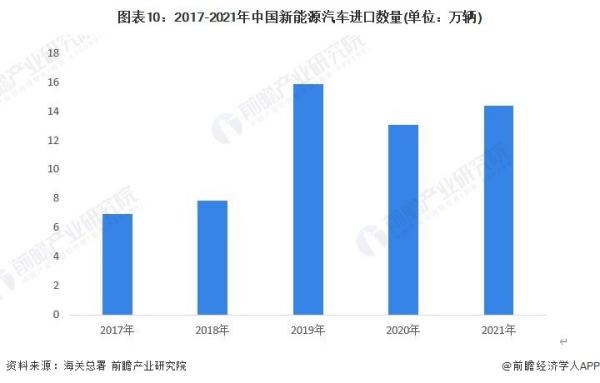 2017-2021年我国新能源汽车进口规模呈扩大趋势。2021年全年进口新能源汽车14.37万辆,同比上升10.03%。
