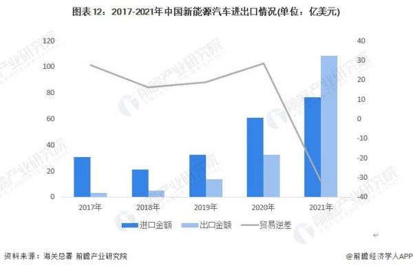 2017-2020年,我国新能源进口量大于出口量,处于贸易逆差状态。2021年,我国新能源汽车出口额首次大于进口额,由贸易逆差转为顺差。