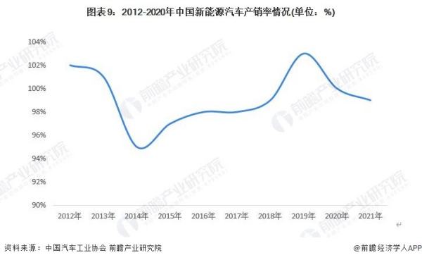 2012-2020年,我国新能源汽车产销率呈现波动性,范围在95%-103%之间,在合理的范围内小幅波动,说明我国新能源汽车行业整体供需较为平衡。2021年,我国新能源汽车产销率为99%。