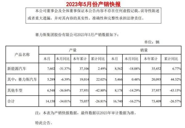 销量既是车企发展的表现参考指标之一,同时也能反应发展的问题所在。根据最新数据显示,2023年5月,公司新能源汽车产量7602辆,同比下降31.37%;销量8562辆,同比下降18.08%。同期,该公司其他车型产量6548辆,同比下降36.84%;销量8178辆,同比下降14.29%。今年前5月,赛力斯的产销总体表现均呈现下降态势,分别达到了26.81%、26.57%。