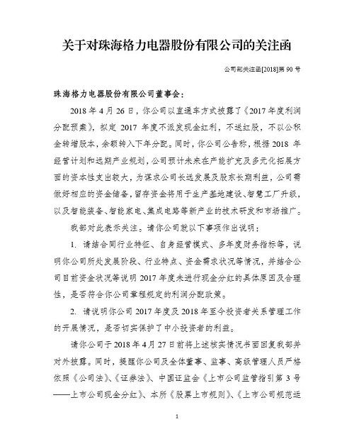 4月26日,格力电器收到深交所关注函,要求结合同行业特征、自身经营模式、多年度财务指标等,说明公司所处发展阶段、行业特点、资金需求状况等情况,并结合公司目前资金状况等说明2017年度未进行现金分红的具体原因及合理性,是否符合公司章程规定的利润分配政策。