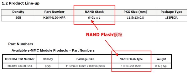 从各家eMMC手册里面,都可以看到这颗eMMC用的是多少容量的,几颗NAND组成,如下截图,容量都是8GB的eMMC: