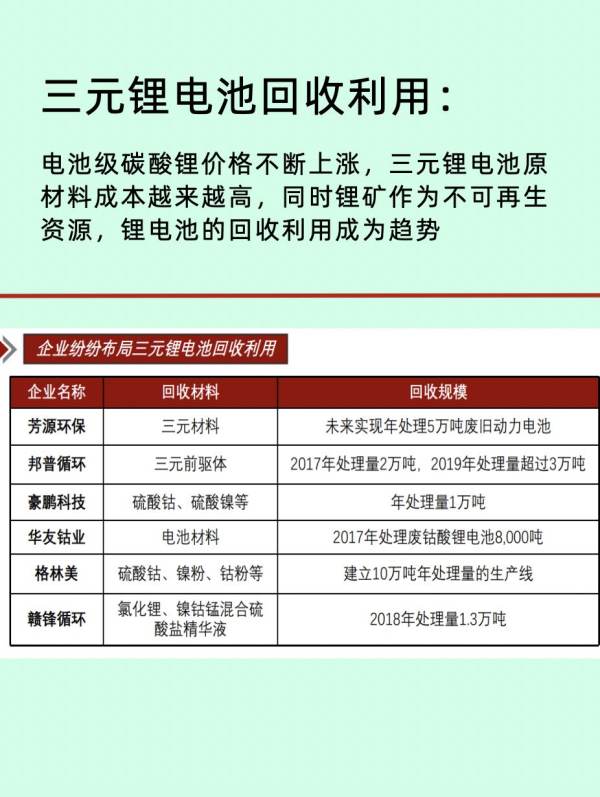 电池级碳酸锂价格不断上涨,三元锂电池原材料成本越来越高,同时锂矿作为不可再生资源,锂电池的回收利用成为趋势。