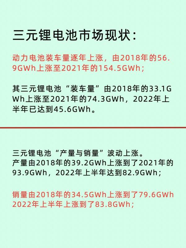 动力电池装车量逐年上涨,由2018年的56.9GWh上涨至2021年的154.5GWh;其三元锂电池“装车量”由2018年的33.1GWh上涨至2021年的74.3GWh,2022年上半年已达到45.6GWh。三元锂电池“产量与销量”波动上涨。产量由2018年的39.2GWh上涨到了2021年的93.9GWh,2022年上半年达到82.9GWh;销量由2018年的34.5GWh上涨到了79.6GWh、2022年上半年上涨到了83.8GWh。