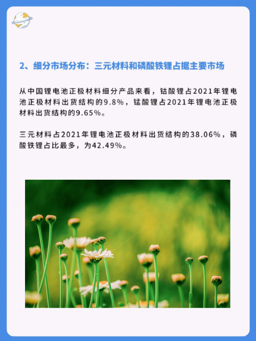 三元材料占2021年键电池正极材料出货结构的38.06%,磷酸铁锂占比最多,为42.49%。