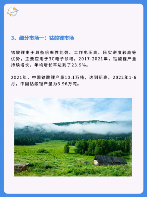 2021年,中国钴酸锂产量10.1万吨,达到新高。2022年1-6月,中国钴酸锂产量为3.96万吨。