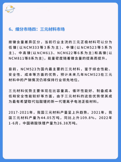 目前,NCM523为国内最主要的三元材料,鉴于综合性能、安全性、成本等方面的优势,预计未来几年NCM523在三元材料中的产销情况,仍将保持行业领先地位。