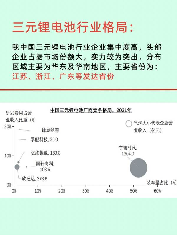 我中国三元锂电池行业企业集中度高,头部企业占据市场份额大,实力较为突出,分布区域主要为华东及华南地区,主要省份为:江苏、浙江、广东等发达省份。