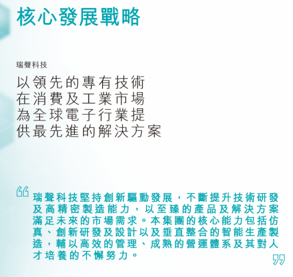 核心发展战略:以领先的专有技术在消费及工业市场为全球电子行业提供最先进的解决方案。